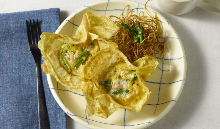 A creamy custard of real crab meat, asparagus, chevre, boursin, and gruyère cheeses baked in citrusy crepe shells. An elegant spin off the traditional crepe.Summary